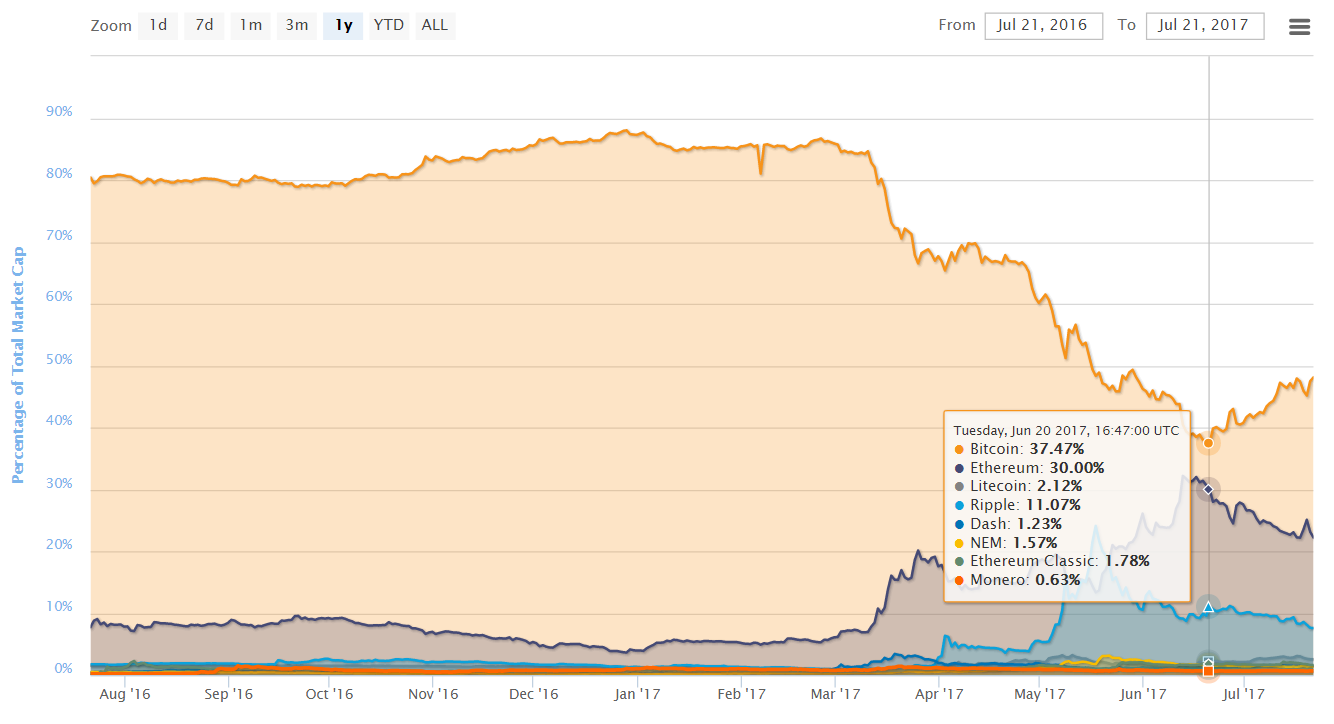 Một tháng trước, khi mà cuộc tranh luận về vấn đề quy mô của Bitcoin vẫn còn âm ỉ và giới thợ đào đang thúc đẩy tiến trình SegWit2x mà không cần đến cơ chế kích hoạt BIP 91, mức độ thống trị của Bitcoin đã giảm đến mức thấp kỷ lục là 37.47%.