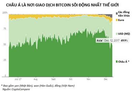 Tính đến cuối tháng 11, Nhật Bản, Hàn Quốc và Việt Nam lại chiếm gần 80% hoạt động giao dịch bitcoin trên toàn cầu, trong khi Mỹ chỉ chiếm khoảng 1/5 tổng khối lượng bitcoin được giao dịch.