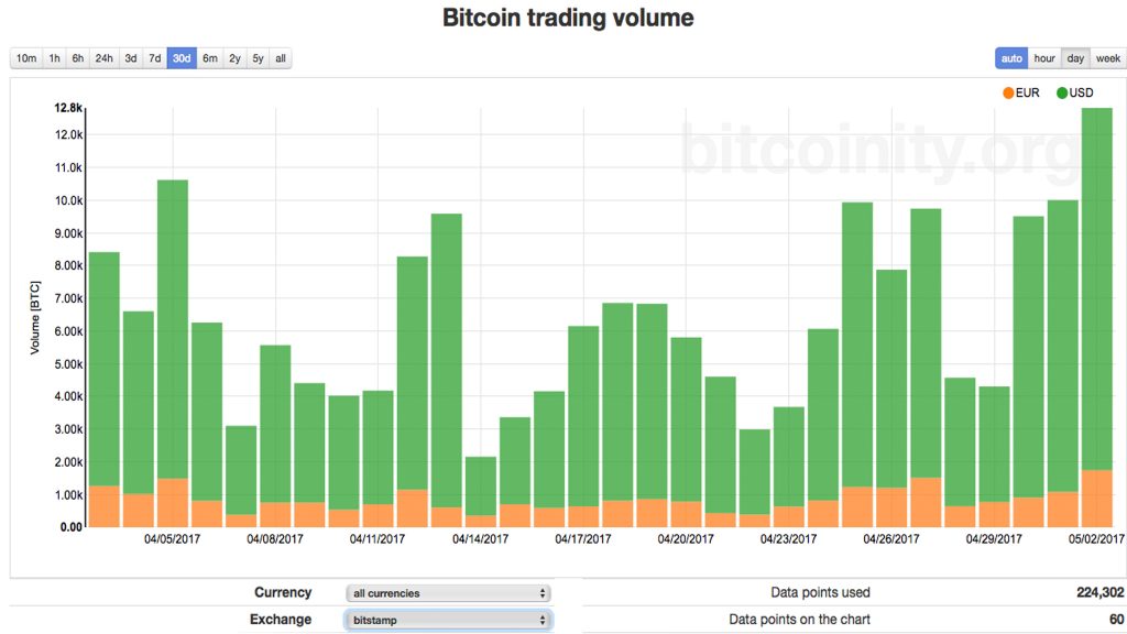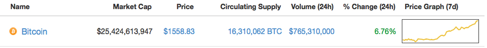 Các thị trường Bitcoin gần đây đã đạt được khối lượng giao dịch khổng lồ với mức giá cao hơn bao giờ hết. Hiện giá mỗi bitcoin đang ở mức trung bình khoảng US $ 1550-60 với khối lượng giao dịch toàn cầu 24 giờ đạt 700 triệu USD tại khắp các sàn giao dịch trên toàn thế giới vào ngày 4 tháng 5.