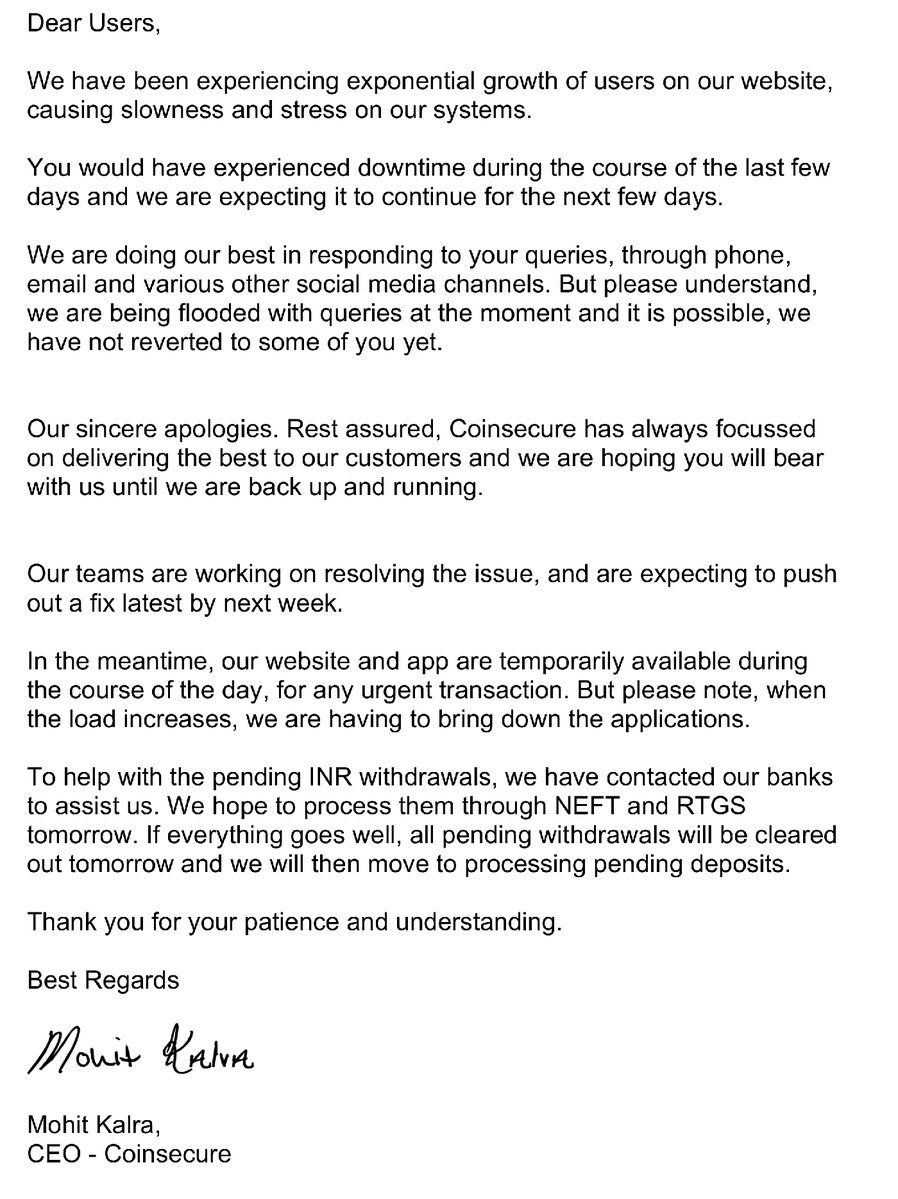 Những sàn giao dịch khác cũng không khá hơn. Coinsecure, một trong những sàn hàng đầu của Ấn Độ đã không thể chịu nổi áp lực, với lý do rằng sự tăng trưởng theo cấp số nhân của người dùng đã gây quá tải cho Công ty. Sàn này dự kiến thời gian chết sẽ kéo dài trong vài ngày tới. Người dùng truy cập vào trang web sẽ bắt gặp thông báo sau.