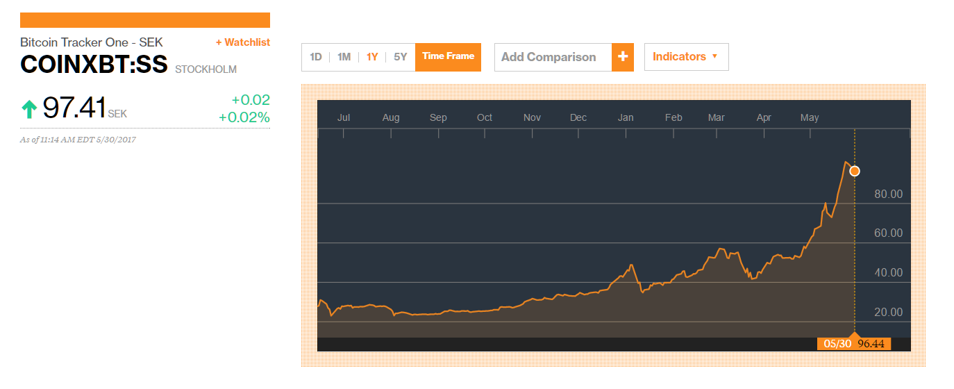 Một Bitcoin ETN phổ biến khác trên thị trường Thụy Điển là Bitcoin Tracker One cũng được liệt kê trên NASDAQ Stockholm. Từ năm ngoái, giá hoặc giá trị của Bitcoin Tracker One đã tăng từ 26,30 lên 96,44 euro, gần gấp bốn lần về giá.
