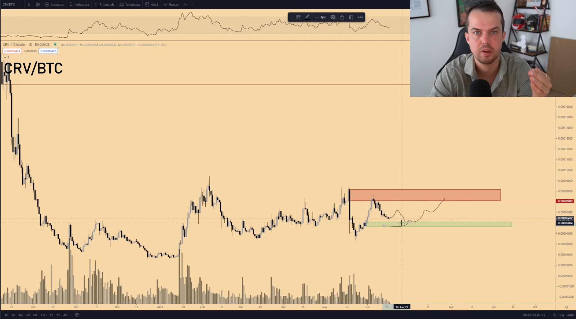 Đồng cuối cùng là sàn giao dịch phi tập trung Curve Finance (CRV/BTC). Nhà phân tích đã làm nổi bật vùng kháng cự quan trọng mà CRV/BTC phải bứt phá để bắt đầu thị trường tăng giá.