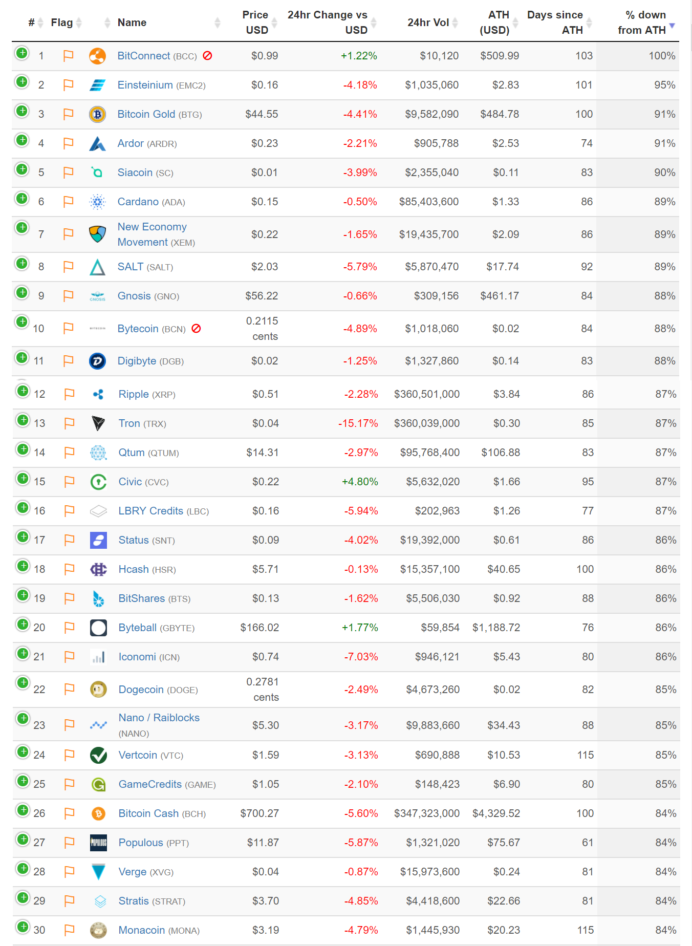 Các thống kê về phần trăm sụt giảm cùng số ngày đã trôi qua kể từ khi giá đạt đỉnh dường như đang trở thành một thước đo phổ biến trên các trang mạng về giá tiền điện tử. Bên cạnh OnChainFX, giờ đã có riêng hẳn một website tên ATHCoinIndex.com được lập nên chỉ để phục vụ mục đích này. Nếu bỏ qua những đồng coin mà rõ ràng đã đạt đến ATH nhờ pump and dump, ta có thể dễ dàng thấy được những kẻ “thua cuộc” lớn nhất tính đến thời điểm hiện tại.