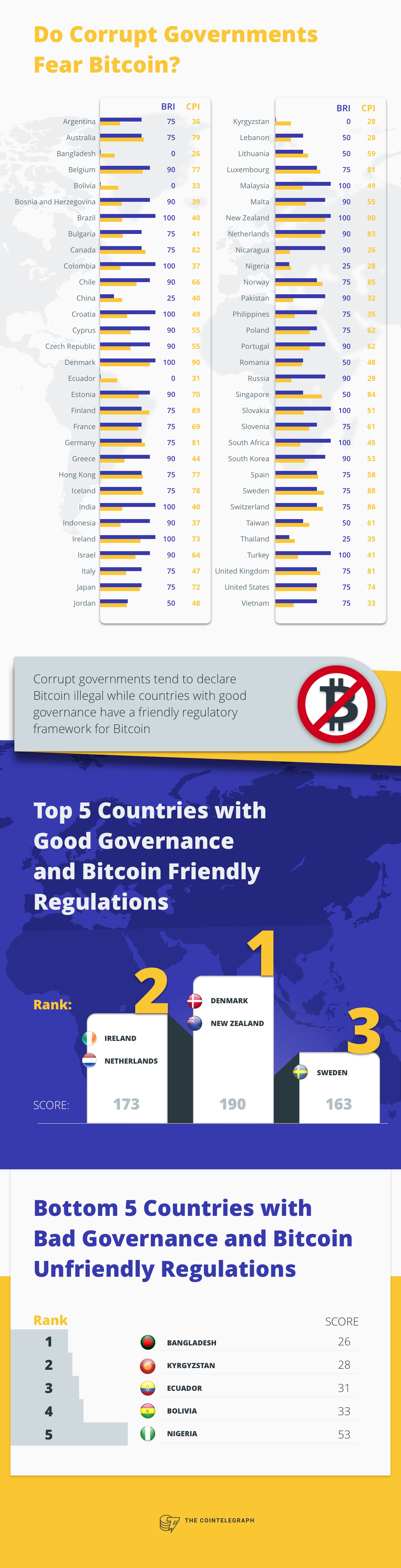 Một cách khác để nhận xét dữ liệu là cộng hai chỉ số BRI và CPI để xếp hạng từng quốc gia. Nước nào mà có tổng là 200 thì vừa sở hữu chính quyền quản lí tốt, vừa là một nơi thân thiện với Bitcoin; trong khi 0 thì tượng trưng cho quản lí yếu kém cùng nghiêm cấm Bitcoin.