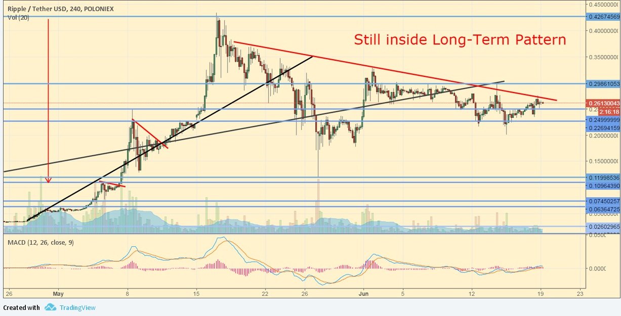 Trong tuần qua Ripple coin đã có những khoảng thời gian ngắn hạn xuất hiện dấu hiệu tăng giá nhưng không thể đột phá về giá cao, tạo thành mô hình hợp nhất dài hạn. Cặp XRP/BTC hiện vẫn nằm trong khoảng hẹp về giá 0,001, trong đó mức kháng cự $0,3 trong cặp XRP/USD.