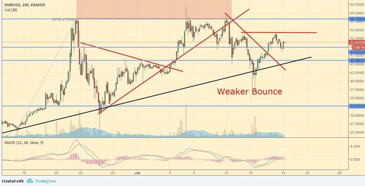 Chỉ có duy nhất Monero là vẫn nằm trong vùng có mức tăng yếu, mặc dù vẫn được giao dịch trên mức $50, khi mức kháng cự $54,50 dừng lại trong ngày cuối tuần. Monero có một số dấu hiệu tăng trên mức đó trong ngắn hạn nhưng hiện tại nếu các nhà đầu tư ngắn hạn thì được khuyến nghị tránh Monero.