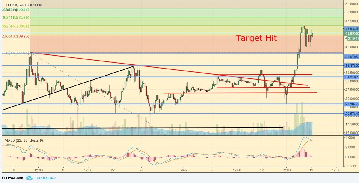 Cuối cùng thì Litecoin cũng phá vỡ được mô hình hợp nhất dài hạn và nhanh chóng tăng trưởng vượt mức cao $38. Đà tăng này đã đạt mức với $44 và tăng trên mức $47 trước khi bước vào gia đoạn củng cố về giá. Xu hướng dài hạn rõ ràng của Litecoin là tăng với mục tiêu tiếp theo là ở mức $51.