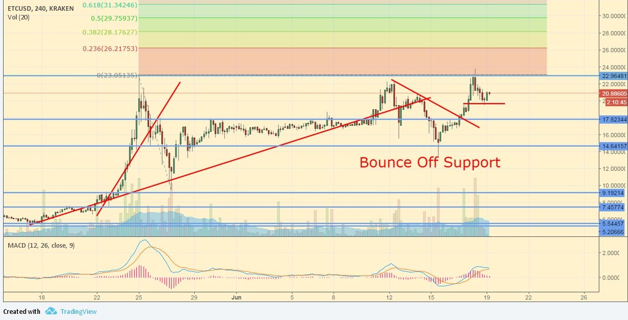 ETC cũng thoát ra khỏi xu hướng giảm ngắn hạn và tăng mạnh lên mức khá cao. Còn Ethereum và Bitcoin suốt tuần qua vẫn di chuyển trong phạm vi hẹp, trong khi XRP cho thấy dấu hiệu tăng mạnh. Dưới đây sẽ là những phân tích về các đồng coin này.