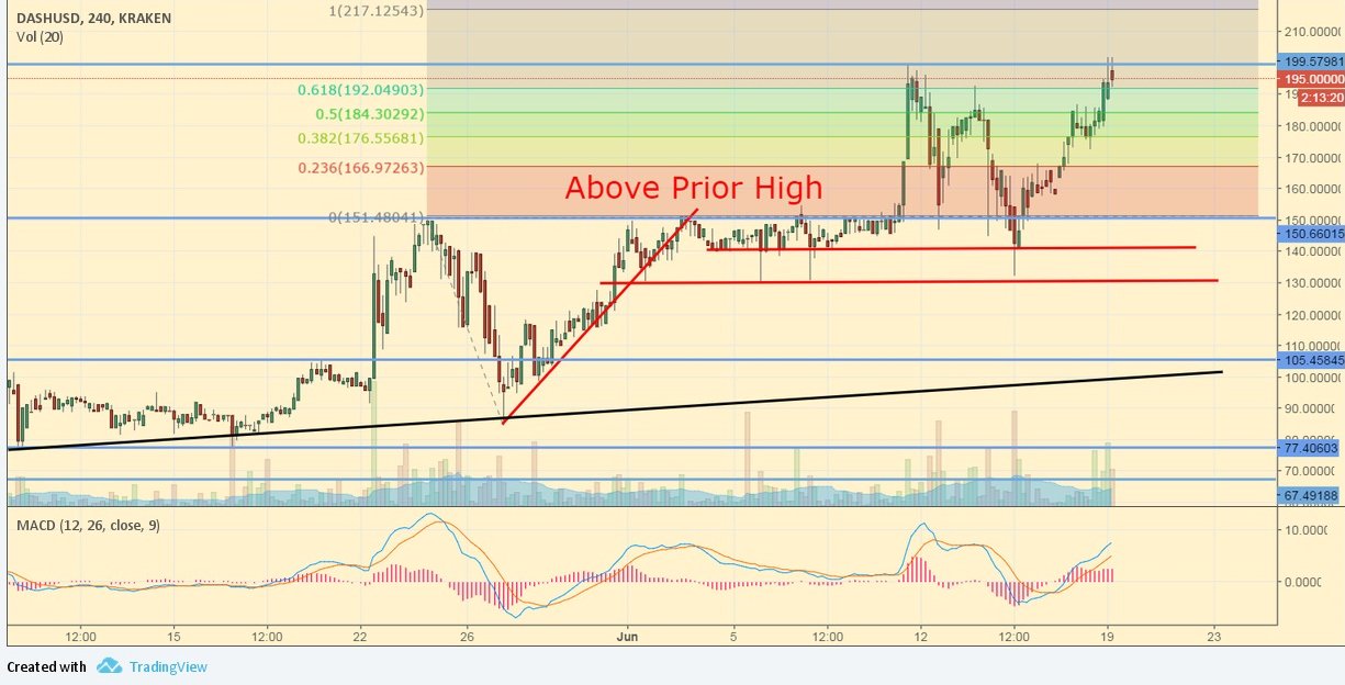 Với Dash đồng tiền ảo này tiếp tục cho thấy đà tăng của mình, giao dịch ngay ở mức $200 sau khi hồi phục và giá vỡ trên đường hướng giảm hạn. Dashcoin có tín hiệu mua ngắn hạn trên $157, với mục tiêu chính là $217. Các mức hỗ trợ được tìm thấy ở mức $167 và $150.