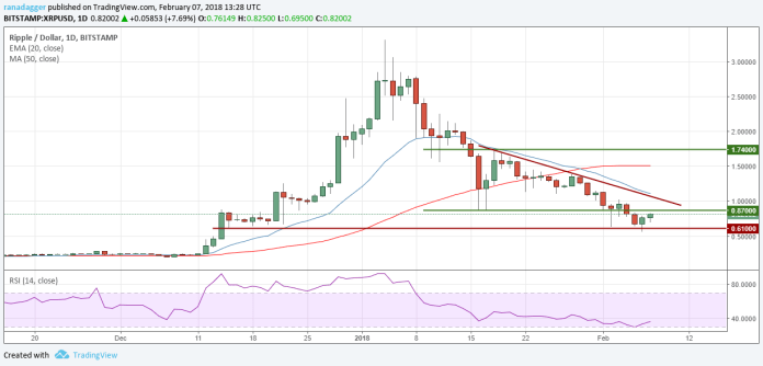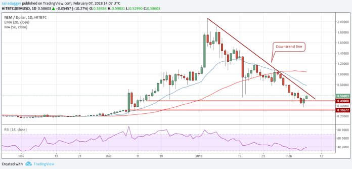 Hiện tại, NEM nằm gần đường xu hướng giảm, có thể sẽ cho thấy ngưỡng kháng cự mạnh. Xu hướng giảm sẽ kết thúc khi cặp XEM/USD duy trì trên đường xu hướng giảm.