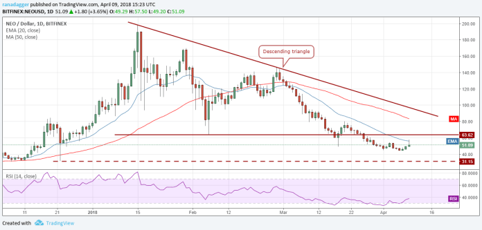 Vùng giữa đường EMA 20 ngày và 63 USD là vùng kháng cự chính, khi NEO vượt qua được vùng kháng cự này, cặp NEO/USD có thể sẽ di chuyển sang đường SMA 50 ngày và tăng giá lên 83 USD và cao hơn đường xu hướng giảm.