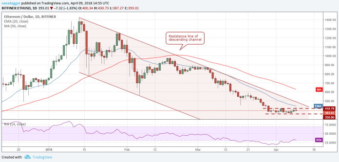 Gấu có thể sẽ kéo giá xuống mức thấp đáy, nếu thành công cặp ETH/USD có thể sẽ giảm xuống mức còn 300 USD.