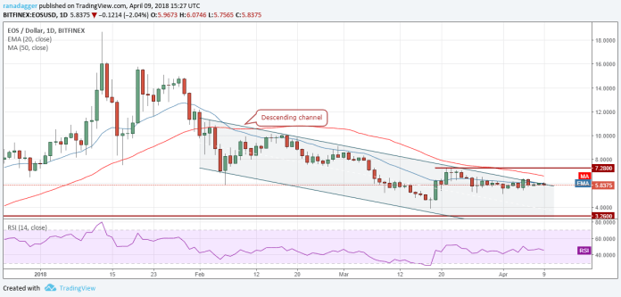 EOS đã cố gắng thoát khỏi kênh giảm dần lần thứ hai, nhưng đã thất bại vì phải đối mặt với quá nhiều ngưỡng kháng cự dưới mức 7.28 USD.