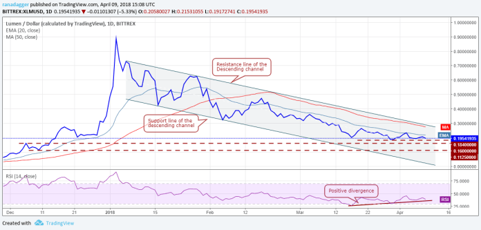 Stellar đã giữ được ngưỡng hỗ trợ quan trọng ở mức 0.184 USD nhưng nó đã đi xuống từ đường EMA 20 ngày. Nếu giá phá vỡ ngưỡng hỗ trợ này nó có thể sẽ giảm xuống tiếp còn 0.16 USD.