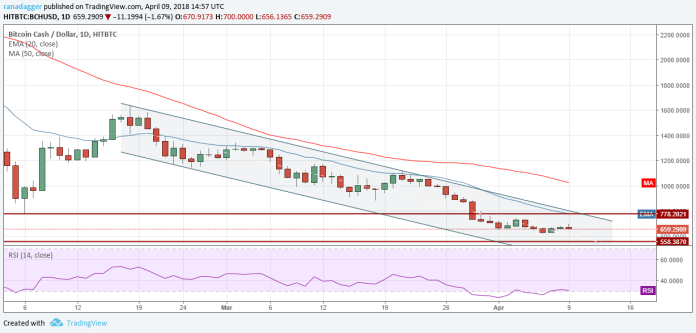 Chưa tìm thấy tín hiệu mua khả quan nào trong Bitcoin Cash, những chú bò đang cố gắng đẩy giá lên đường kháng cự của kênh giảm dần.