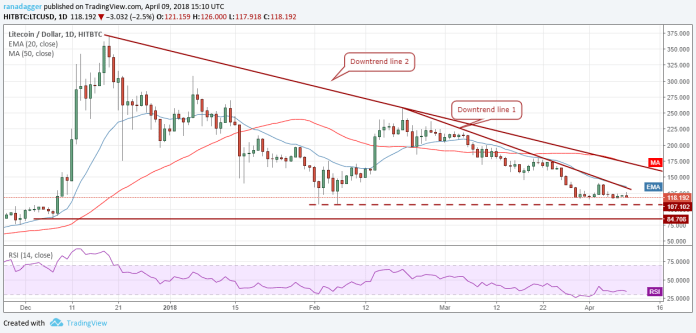 Litecoin đã duy trì được mức hỗ trợ 114 USD nhưng sự phục hồi của nó đã bị đình trệ ở mức 126 USD. Nó thậm chí không thể chạm vào đường xu hướng giảm 1. Và đường EMA 20 ngày cũng gần đường này.