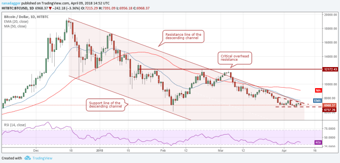 Giá bitcoin hôm nay đang hướng về ngưỡng hỗ trợ 6.757 USD và đang bị xu hướng giảm chiếm ưu thế sau khi không thể thoát khỏi đường kháng cự của kênh giảm dần.