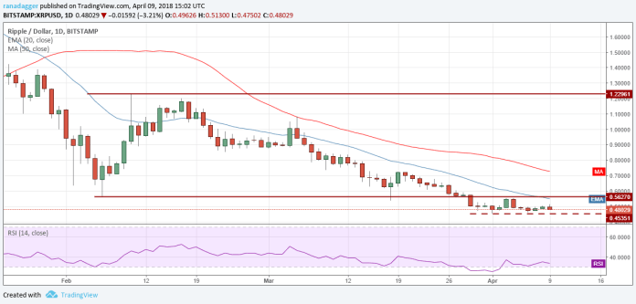 Ripple đã chạm mức thấp 0.453 USD vào ngày 1 tháng 4 và nó đang cố gắng phục hồi từ mức này, nhưng có lẽ tín hiệu mua vào vẫn còn khá chậm chạp và ngưỡng kháng cự của nó ở mức 0.5627 USD