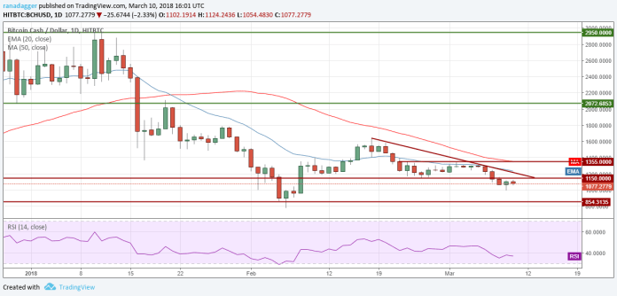 Chúng tôi kỳ vọng rằng Bitcoin Cash sẽ điều chỉnh xuống mức 950 USD kể từ hai phân tích trước đó của chúng tôi, nhưng các nhà đầu cơ giá tăng đã duy trì mức 1.000 USD. Vào ngày 10/03, giá bật lên từ mức 989.8418 USD.