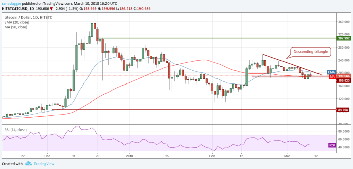 Litecoin đã phá vỡ và đóng cửa bên dưới tam giác giảm dần vào ngày 09/03, nhưng nhà đầu cơ giá tăng đã nhanh chóng đẩy giá lên trên mức 185 USD vào ngày 10/03.
