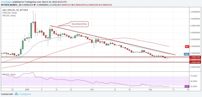Chúng ta vẫn duy trì xu hướng giảm cho cặp ADA/BTC miễn là nó giao dịch dưới đường xu hướng giảm và đường EMA-20 ngày.