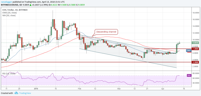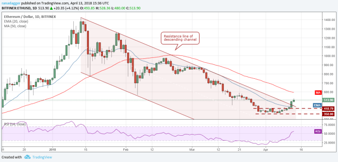 Đây là lần đầu tiên cặp ETH/USD vượt qua đường kháng cự của kênh giảm dần, đó là sự tăng trưởng tích cực.