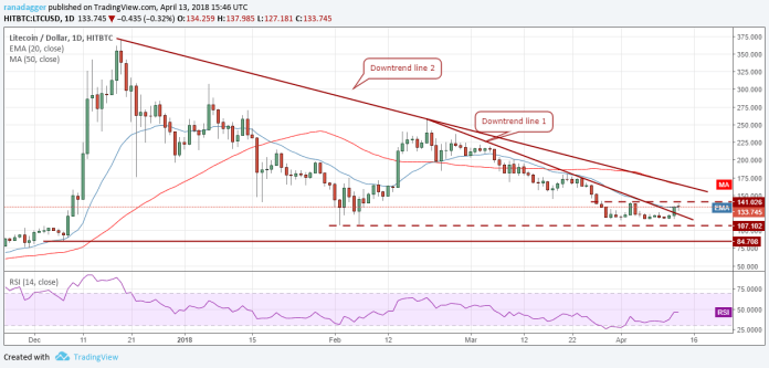 Litecoin đã vượt qua được kháng cự đầu tiền của đường xu hướng giảm 1, và đang nỗ lực vượt qua đường EMA 20 ngày.