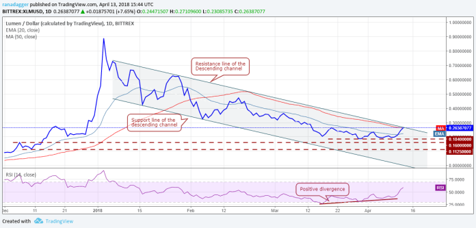 Chúng tôi đã lạc quan về Stellar do sự phân tán thuận của chỉ số sức mạnh hằng ngày RSI. Hôm qua, Stellar đã khẳng định quan điểm tích cực của chúng tôi là đúng khi mà nó đã vượt ra khỏi đường EMA 20 ngày.
