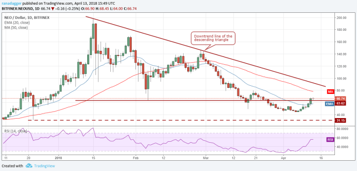 Cặp NEO/USD nên tìm thấy ngưỡng hỗ trợ mạnh mẽ trong vùng giữa đường EMA 20 ngày và tại mức 63.62 USD. Mức dừng lỗ ban đầu có thể được giữ ở mức 44 USD.