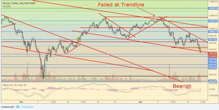 Sau khi chạm gần ngưỡng hỗ trợ 9.000 USD, Bitcoin rơi xuống dưới ngưỡng hỗ trợ gần 8.400 USD trong phiên giao dịch hôm nay và phá vỡ ngưỡng 8.000 USD lần đầu tiên kể từ giữa tháng hai.