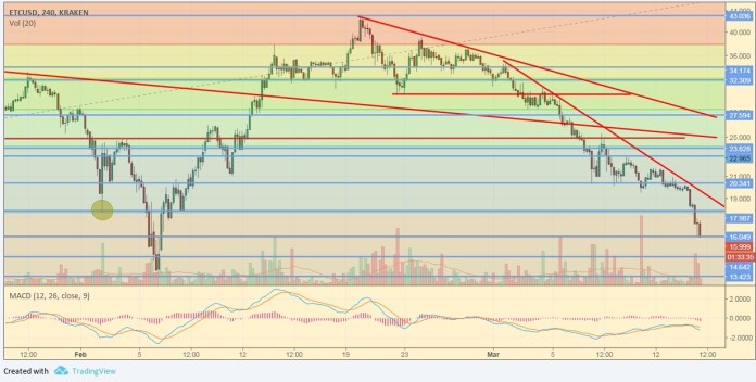 Ethereum Classic đã phá vỡ xuống mức thấp đáy không chỉ 20 USD mà còn xuống dưới ngưỡng hỗ trợ 18 USD trong đợt bán tháo hôm nay và hiện đang phải test lại xung quanh mức 16 USD.