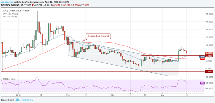 Chúng tôi đã đề xuất các vị trí ở mức 7.5 USD trong kỳ phân tích trước, và hiện tại EOS đang được giao dịch trên mức này, đây là một tín hiệu tích cực, tuy nhiên EOS vẫn chưa thể phá vỡ trên mức 9.5 USD.