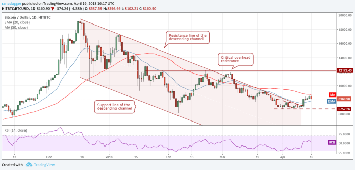 Gấu và Bò tiếp tục có những màn kéo co gây cấn. Bitcoin sau khi tăng lên mức cao 8.328 USD, thì hiện tại đang kẹt tại ngưỡng 8.000 USD và đã phải vất vả để vượt qua đường SMA 50 ngày. Trong khi đó các Altcoin có vẻ khả quan hơn một chút. Hãy cùng Blogtienao đến với bài phân tích giá hôm nay (17/4) nhé.