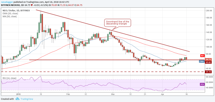 Trên đường xu hướng tăng, SMA 50 ngày đóng vai trò như là kháng cự.Một khi NEO phá vỡ được mức kháng cự này, cặp ngoại tệ NEO/USD sẽ tập trung vào đường xu hướng giảm của tam giác giảm dần.