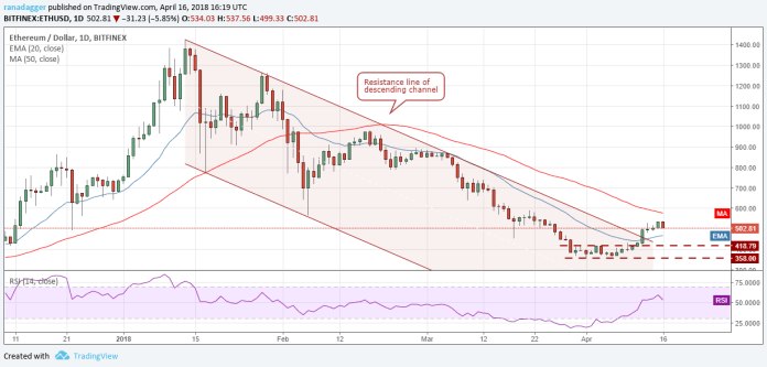 Trong kỳ phân tích trước, chúng tôi đã dự đoán Ethereum sẽ tập trung tại đường SMA 50 ngày, nhưng nó đã giảm từ mức 537 USD, nó bây giờ có thể sẽ tập trung cho đường EMA 20 ngày và ở mức 418 USD.