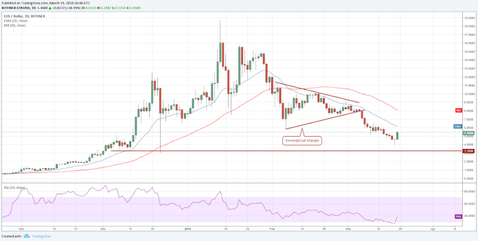 Vì đang trong đà tăng giá EOS sẽ phải đối mặt với sức kháng cự mạnh ở mức 6 USD và sau đó là 8 USD.