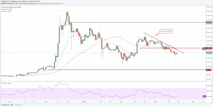 Litecoin đã giảm xuống còn 144 USD vào ngày 18 tháng 3, rất gần với mức dự báo của chúng tôi là 141 USD. Nó đang quay trở lại đường xu hướng giảm và sẽ đóng vai trò kháng cự.