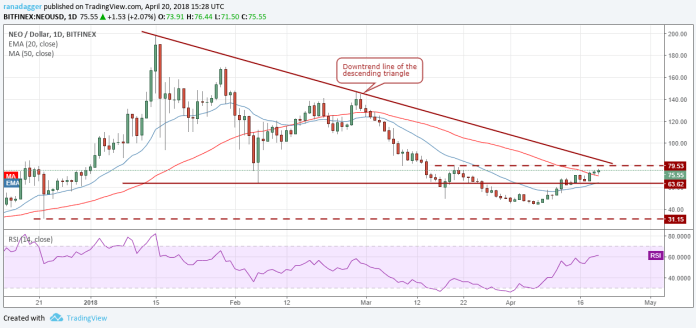 NEO cuối cùng cũng đã phá vỡ được đường SMA 50 ngày, nhưng nó sẽ phải đối mặt với ngưỡng kháng cự tại mức 80 USD, từ đường xu hướng giảm của tam giác giảm dần và đường ngang.
