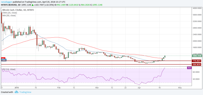 Trong phân tích trước đây, chúng tôi đã dự đoán rằng Bitcoin Cash không phải đối mặt với kháng cự tại đường SMA 50 ngày, và quả thật như vậy. Giá đã thu hẹp qua mức trung bình động vào ngày 19 tháng 4 và đã chạm mục tiêu đầu tiên của chúng tôi ở mức 1.114 USD.