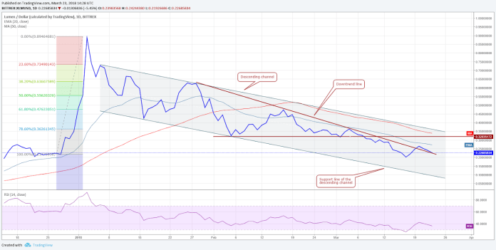 Chúng tôi đã đề xuất các vị trí dài hạn cho Stellar nếu đà mua suy yếu ở mức 0.23 USD. Hiện tại, nó đang cố gắng duy trì trên đường xu hướng giảm.