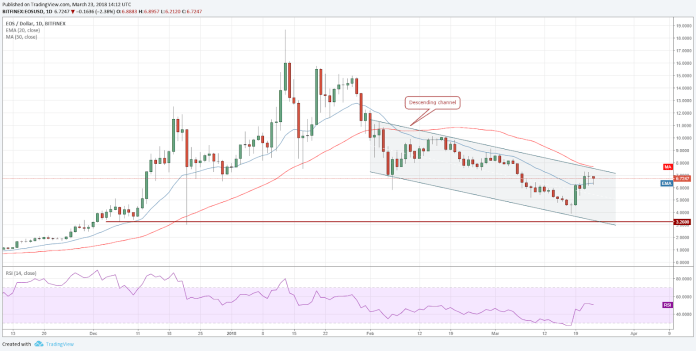 EOS đã tăng gần đường kháng cự của kênh giảm dần, đây là một rào cản lớn để vượt qua vì giá đã giảm xuống đường kháng cư này ở hai lần trước đó.
