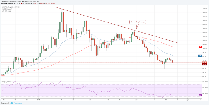 Trong kỳ phân tích của chúng tôi trước đây , chúng tôi đã đề xuất các vị trí dài hạn trong NEO nếu nó duy trì được mức 65 USD. Hiện tại, chúng tôi không nhận thấy bất kỳ sự hỗ trợ mua mạnh nào ở mức này. Nếu vùng hỗ trợ bị phá vỡ, khả năng giảm xuống mức thấp nhất vào ngày 18 tháng 3 là 49,04 USD có thể xảy ra.