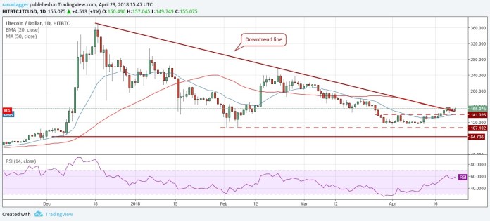 Litecoin đã bứt phá ra khỏi đường xu hướng giảm và đường SMA 50 ngày vào ngày 20/4. Vào ngày 21/4, giá lại trượt xuống dưới đường xu hướng giảm nhưng đã tìm thấy sự hỗ trợ ở các mức thấp hơn.Đây là một dấu hiệu tích cực, và nó cũng cho thấy rằng phe mua đã sẵn sàng mua vào ở những mức thấp hơn.