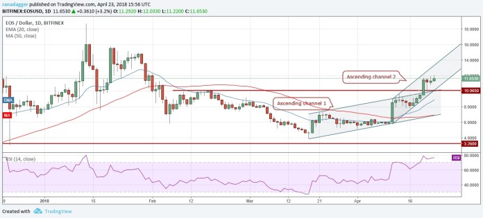 EOS đã bắt đầu một xu hướng tăng mới và đang bên trong kênh tăng dần 2, nó đã vượt qua target đầu tiên của chúng tôi và hiện tại đang tiếp tục tiến tới target thứ hai ở mức trên 12 USD.