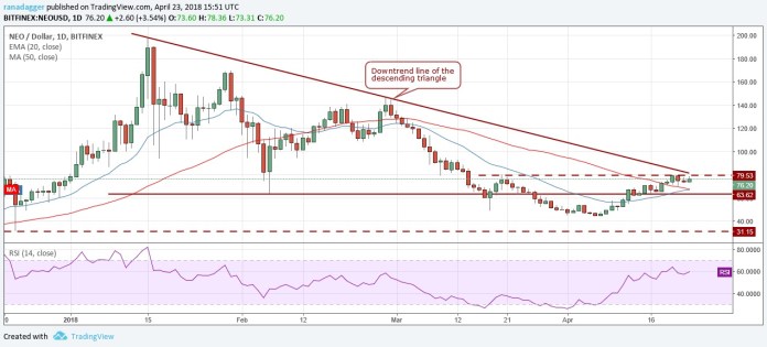 Vào 21/4, cặp NEO/USD đã giảm nhưng vẫn ở trên mức dừng lỗ, nó đã tìm thấy ngưỡng hỗ trợ tại đường SMA 50 ngày.