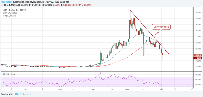 NEM đã giảm khoảng 74% so với mức lập đỉnh của nó. Nó đã tìm thấy một số ngưỡng hỗ trợ mua ở mức 0.45747 USD, chỉ dưới mức quan trọng là 0.49 USD.