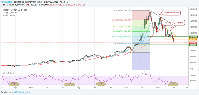 Bitcoin đang trong tình trạng “thoi thóp”, nó đã giảm khoảng 55% so với mức cao ngày 17/12/2017 ( 19.496 USD ). Với đợt sụt giảm này nó đã quay lại mức 78,6% của đợt tăng giá mới nhất. Chúng tôi tìm thấy những dấu hiệu đầu tiên khi mua vào ở mức 8000 USD.