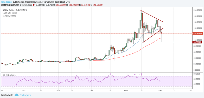 NEO đã phá vỡ hình tam giác đối xứng vào ngày 1 tháng 2 năm 2018. Ngày hôm nay, nó đã giảm xuống gần ngưỡng hỗ trợ quan trọng là 93,53 USD, dẫn đến sức mua vào tăng mạnh.