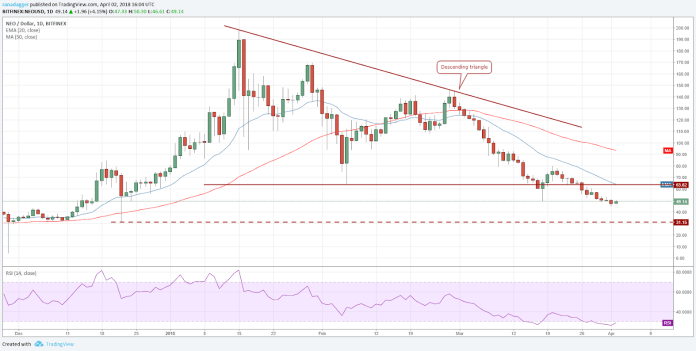 NEO đã phá vỡ mức thấp vào ngày 18 tháng 3 ở mức 49.04 USD, đây là một sự tăng trưởng không rõ ràng, ngưỡng hỗ trợ tiếp theo sẽ nằm dưới ngưỡng 31.15 USD.