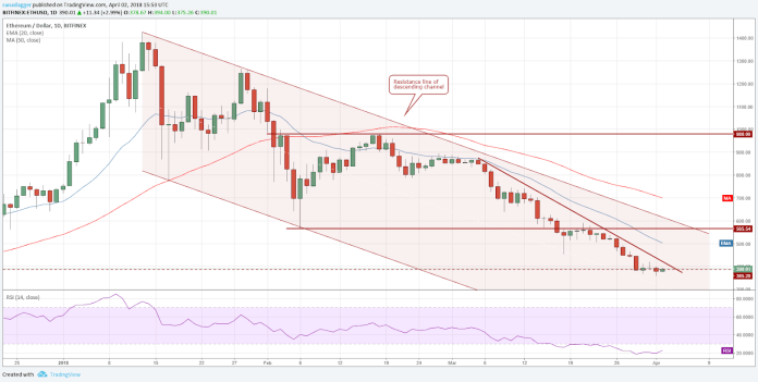 Bất kỳ sự phục hồi nào của cặp ETH/USD sẽ phải đối mặt với đường xu hướng giảm và đường EMA 20 ngày.